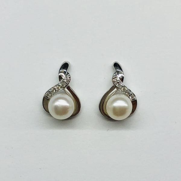 14 karátos fehér arany brill fülbevaló. Tisztasága és színe a nemzetközi besorolás szerint: vs,g, nagysága 0,16ct, édesvízi tenyésztett gyönggyel díszítve.