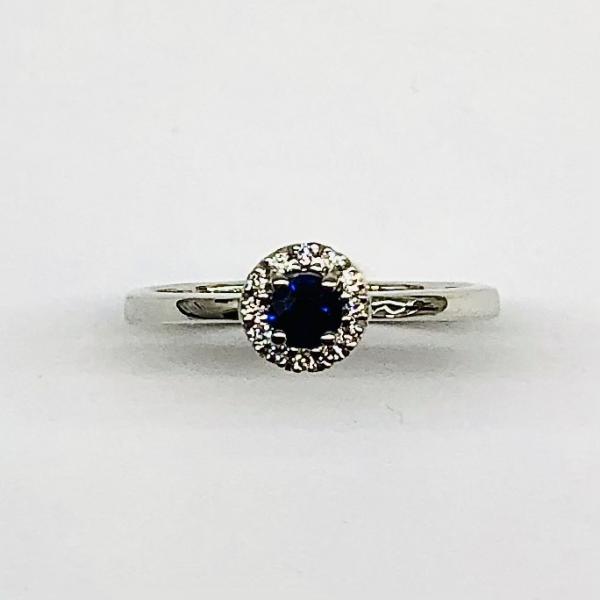 14 karátos fehér arany briliáns gyűrű. Tisztasága és színe a nemzetközi besorolás szerint: vs,g, nagysága 0,06ct, a zafír kő 0,23ct.