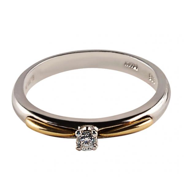 14 karátos fehér és sárga arany brill gyűrű. Tisztasága és színe a nemzetközi besorolás szerint: vs,g, nagysága 0,05ct.