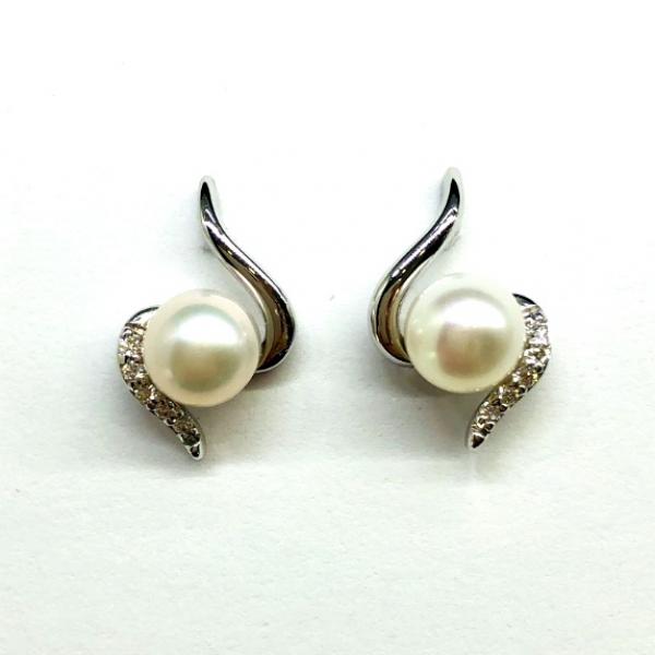 14 karátos fehér arany brill fülbevaló. Tisztasága és színe a nemzetközi besorolás szerint: vs,g, nagysága 0,06ct, édesvízi tenyésztett gyönggyel díszítve.